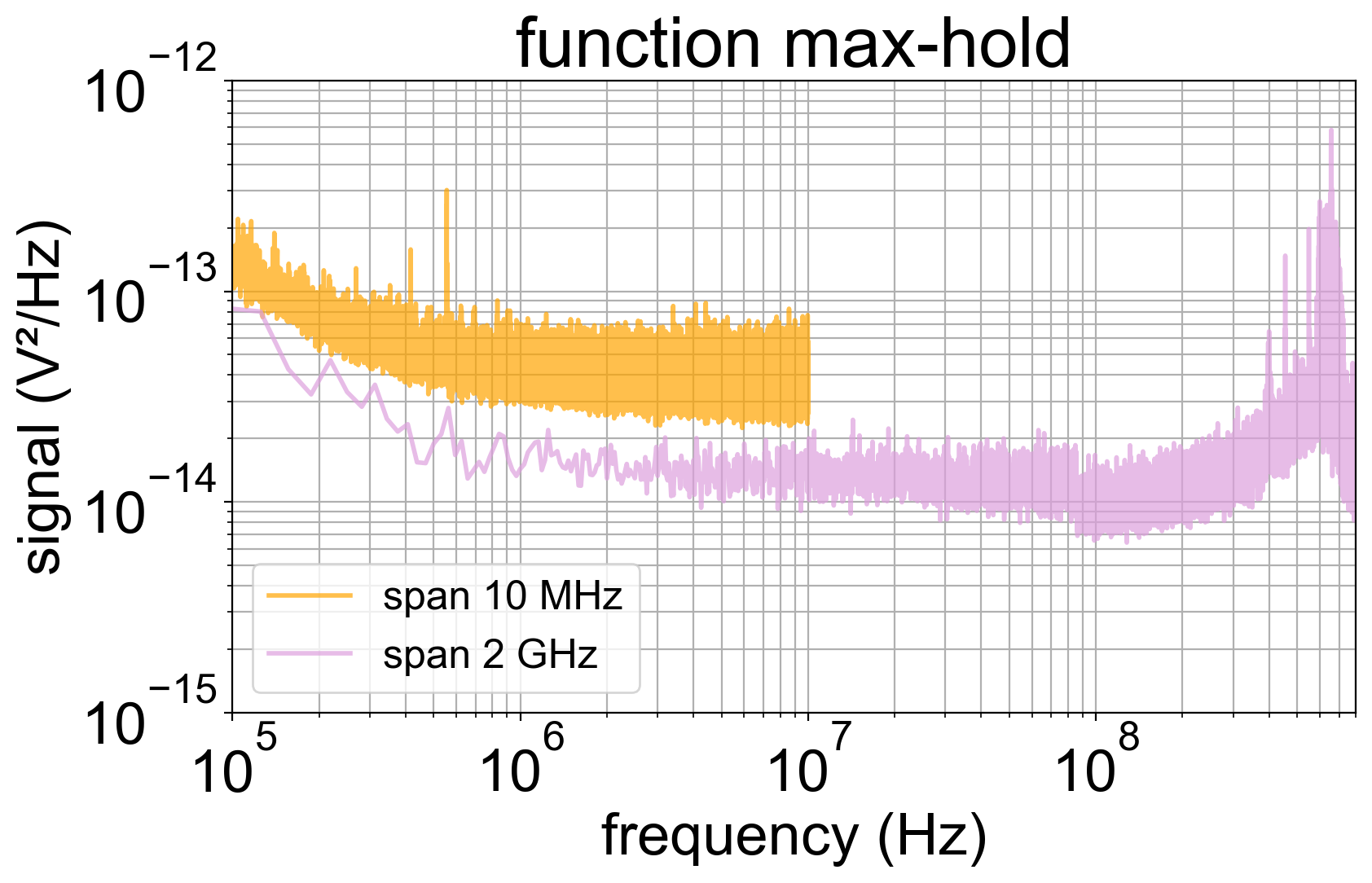 2. Why is there an offset between the spectra with span 10 MHz and 2 GHz, if acquired with max-hold?