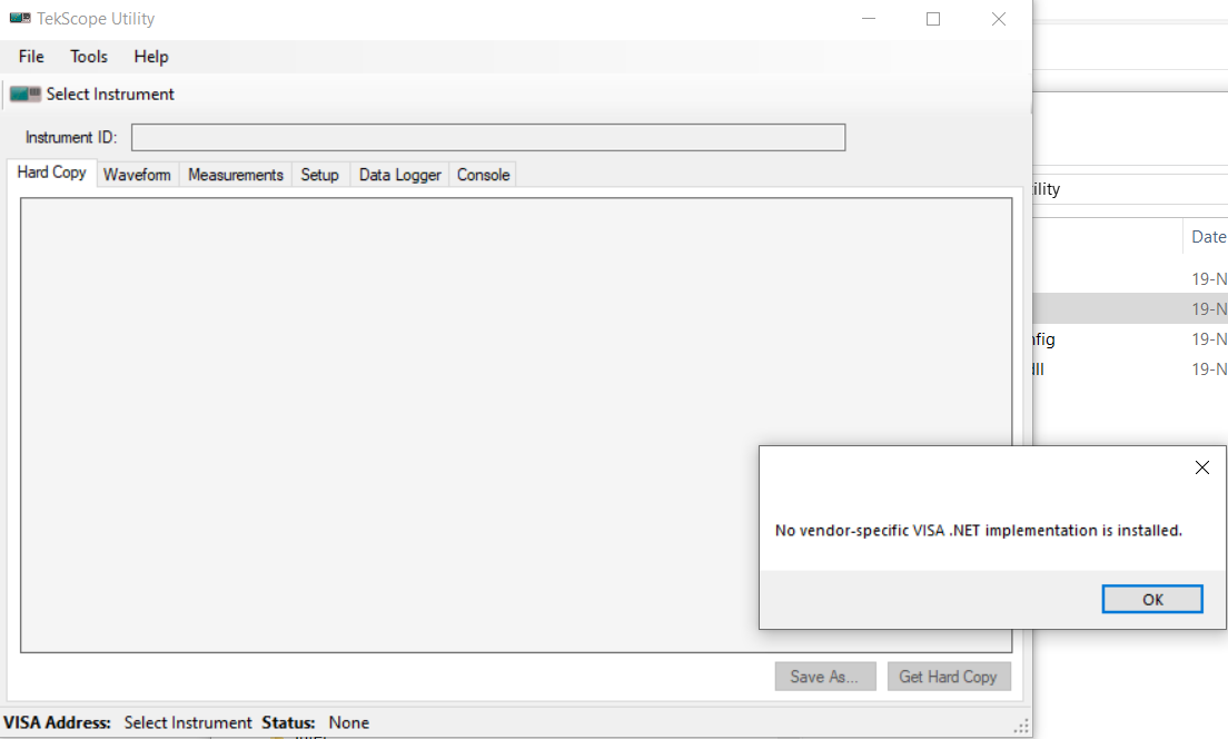 Unfortunately, the TekScope Utility shows an error message of "No vendor-specific .NET implementation is installed."