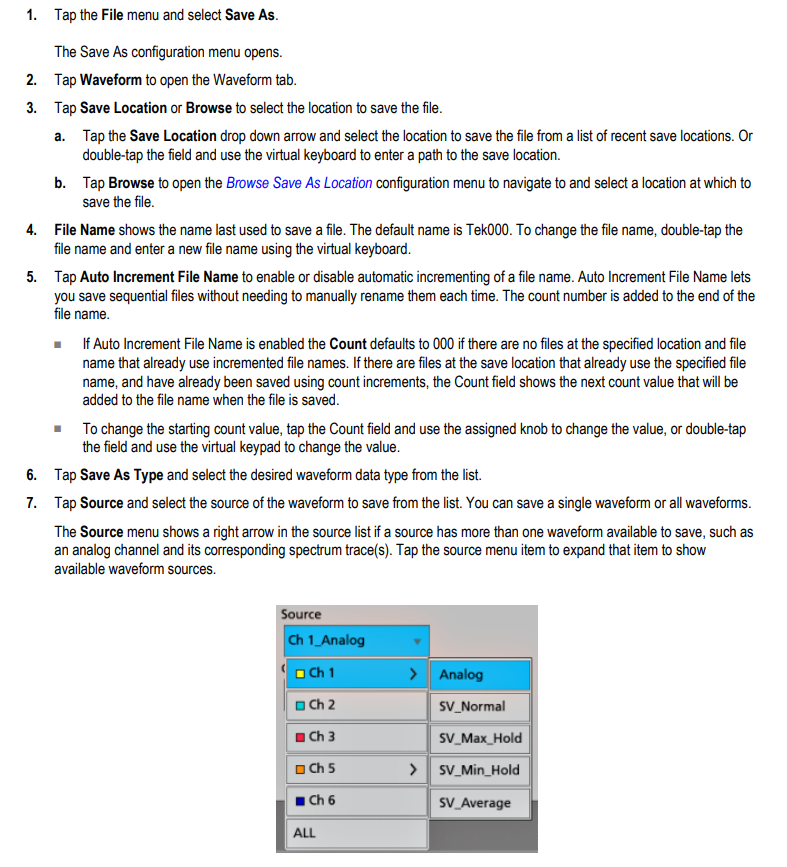 I would like to know how to do "Save a waveform or spectrum trace to a file" for all channels as you can see there is an option for "ALL".