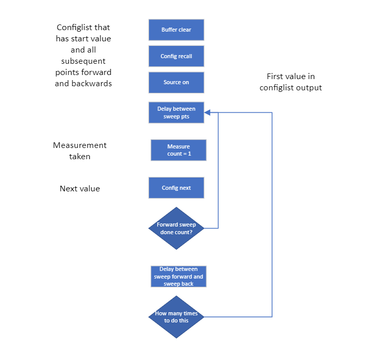 I was able to find trigger flow in Trigger -> Configure. However, it introduces delay in each successive measurement rather than between forward and reverse sweeps. Also, how can we go back and put the correct code. What is the exact keyword to put such kind of delay?