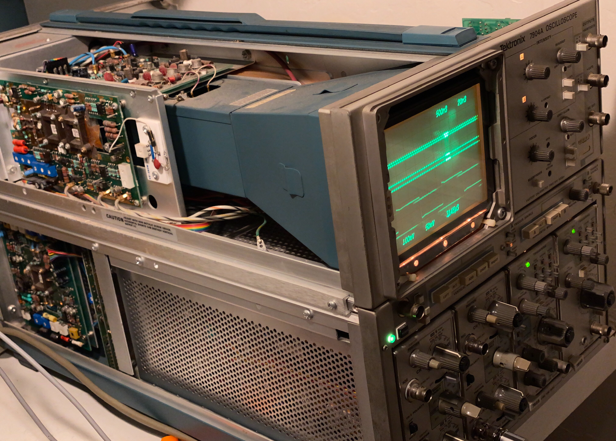 Restored a fine 7904A, low SN, 1982, stored for decades. Usual cleaning of switches, contrlols, the CRT, bright and in focus. But all surfaces, PCB, PS, HV, CRT coated with dust.